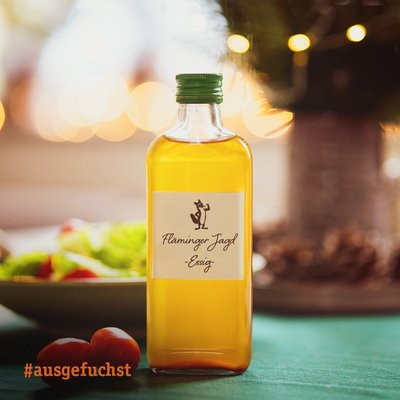 3. Den Essig durch 2 Kaffeefilter seihen und in eine leere, gesäuberte Fläminger Jagd Flasche füllen. Abschließend das Etikett aufkleben, beschriften – und der würzig-säuerliche Fuchs ist einsatzbereit.